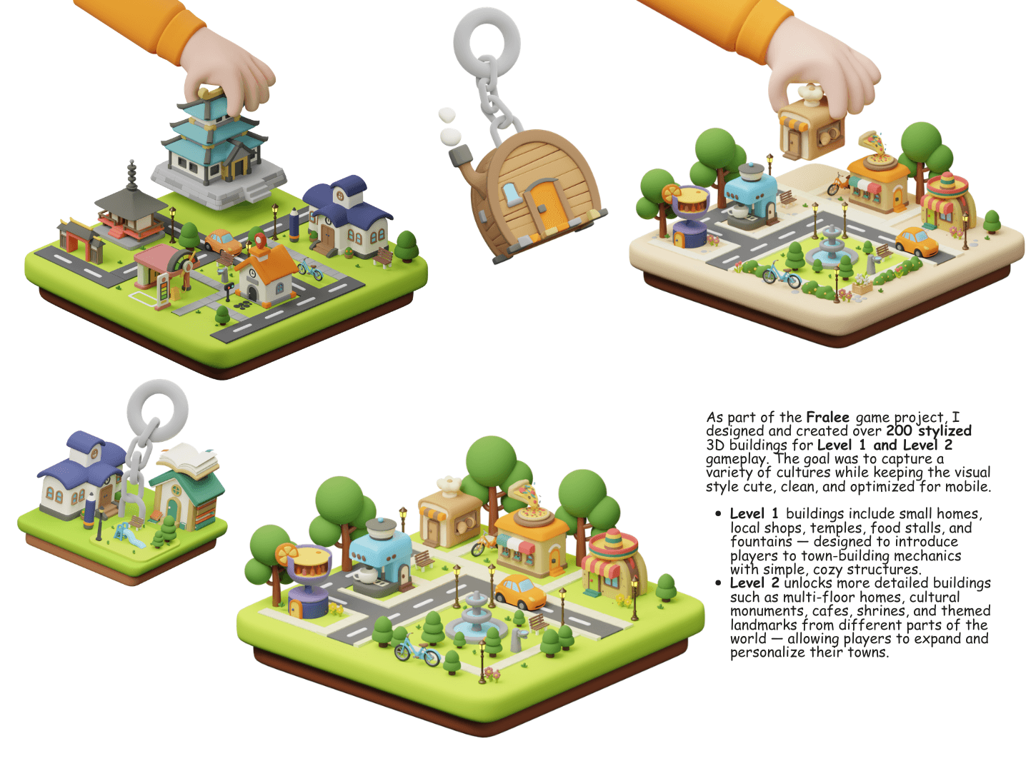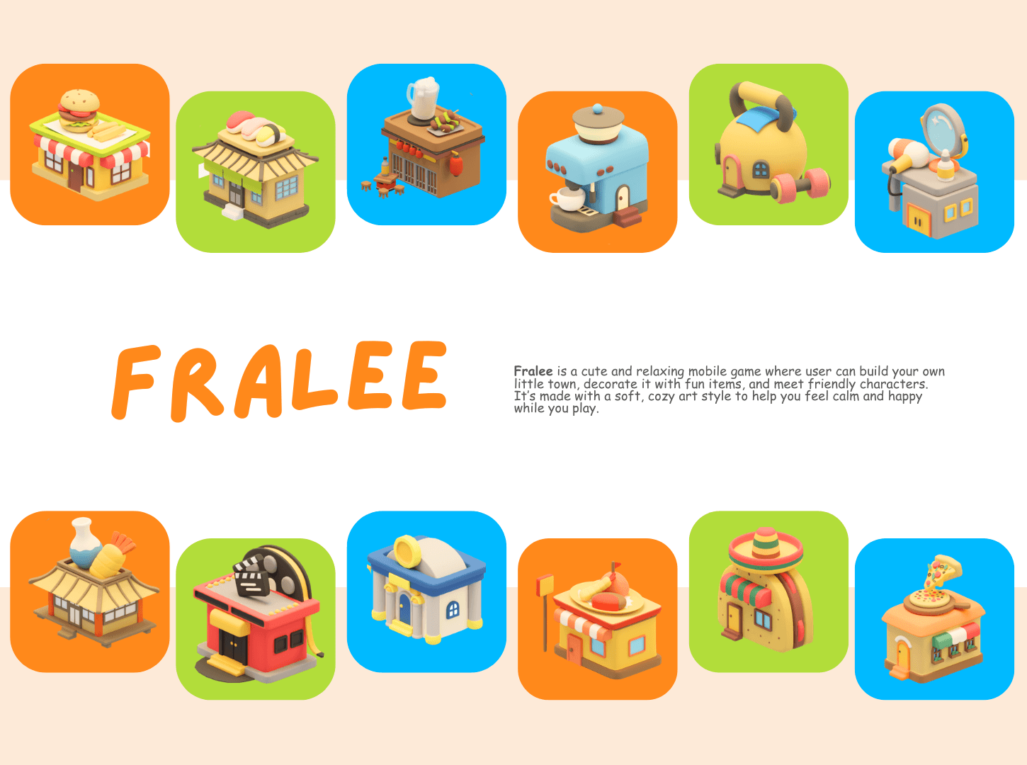Fralee is a cute and relaxing mobile game that lets players build and decorate their own miniature towns. The project features over 200 stylized 3D buildings, ranging from simple food stalls and homes to detailed cultural landmarks and cafes. Every asset is designed with a soft, toy-like aesthetic and warm colors to create a peaceful world that is fun to build and easy to explore.
