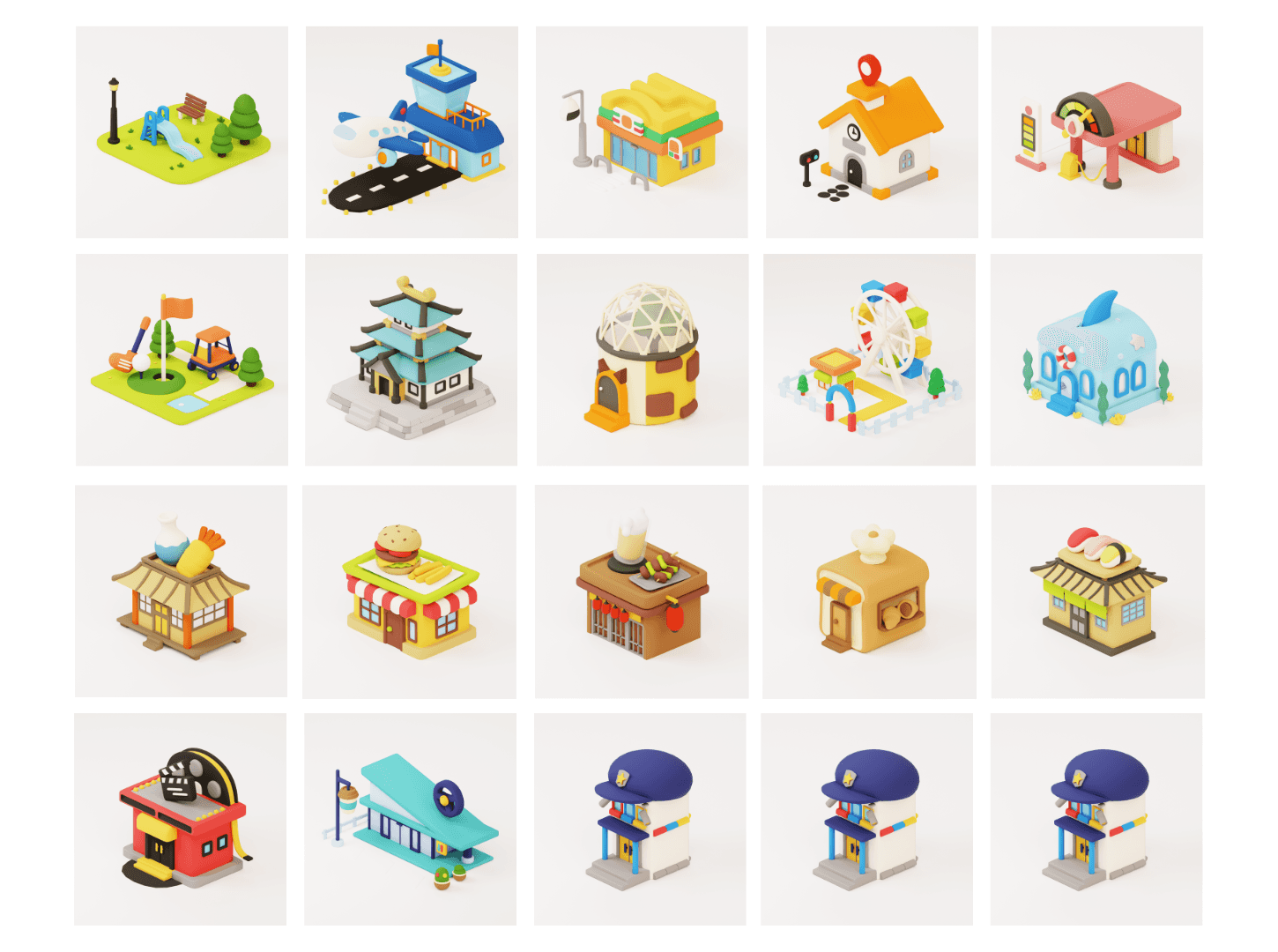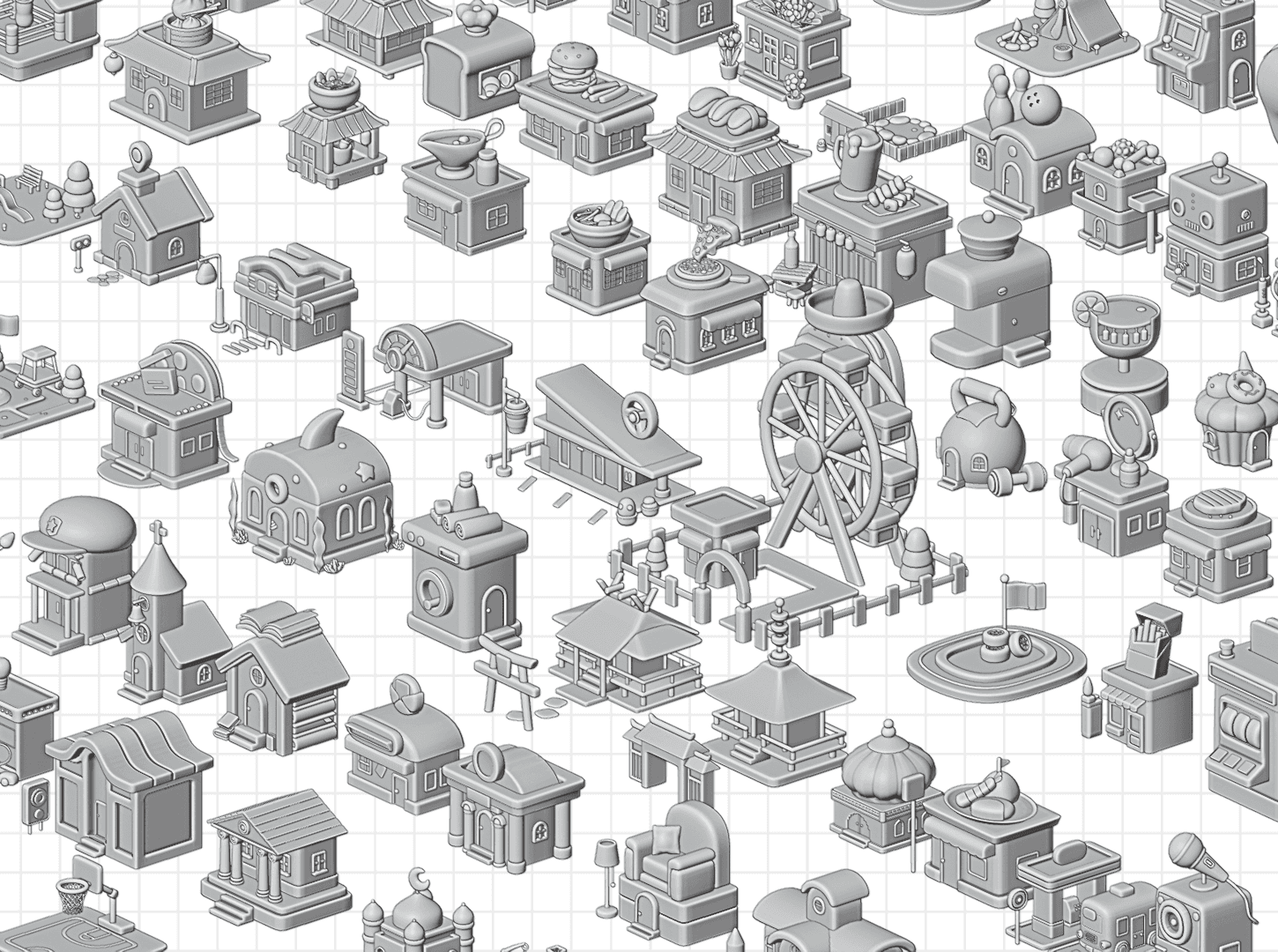 The challenge was creating a huge variety of buildings while keeping a unified look. To solve this, I developed a visual set of rules for colors and shapes. By using a consistent "toy-like" style and a bright color palette, I ensured that everything from a small sushi stand to a large Ferris wheel feels like it belongs in the same happy world.