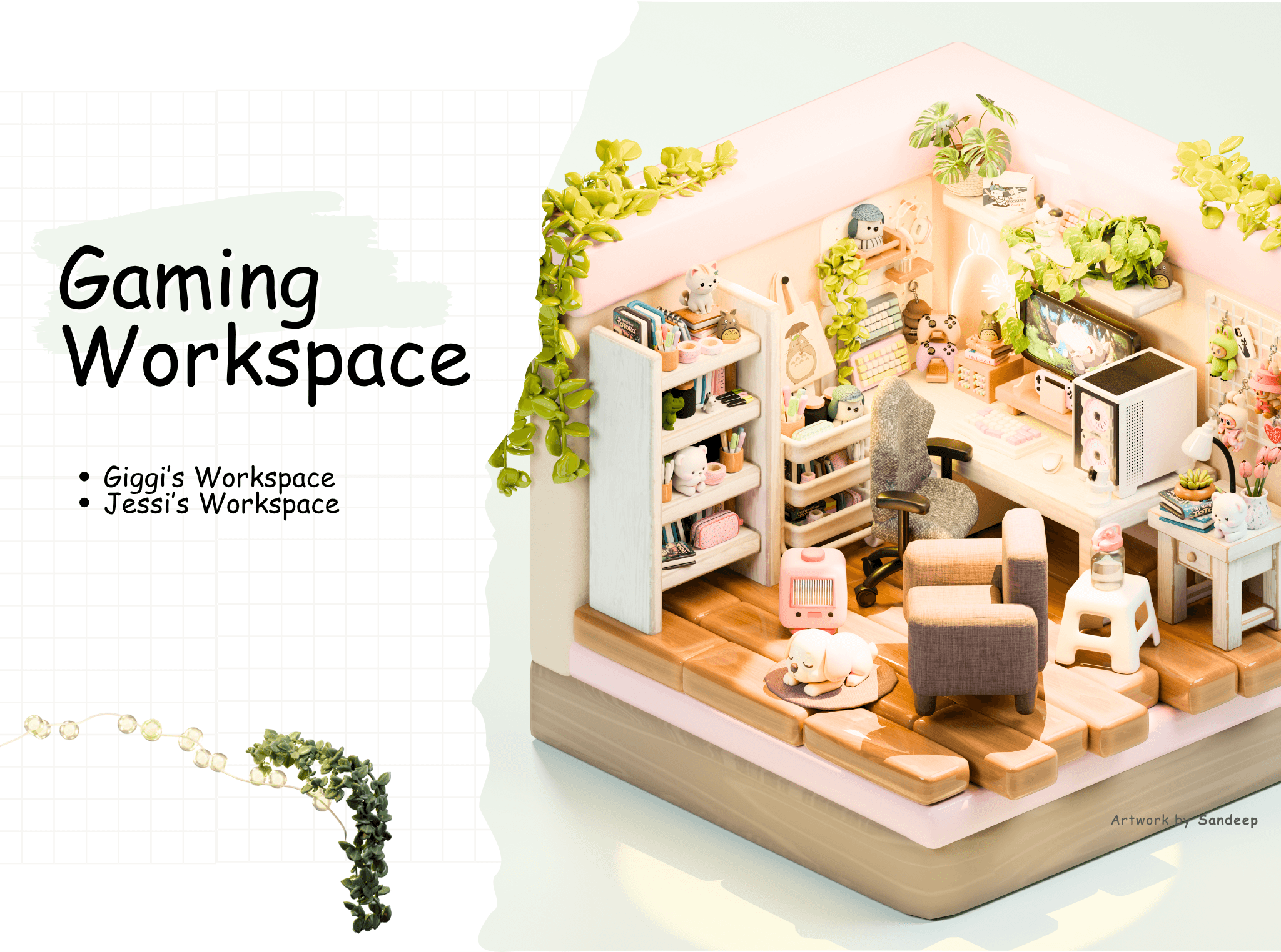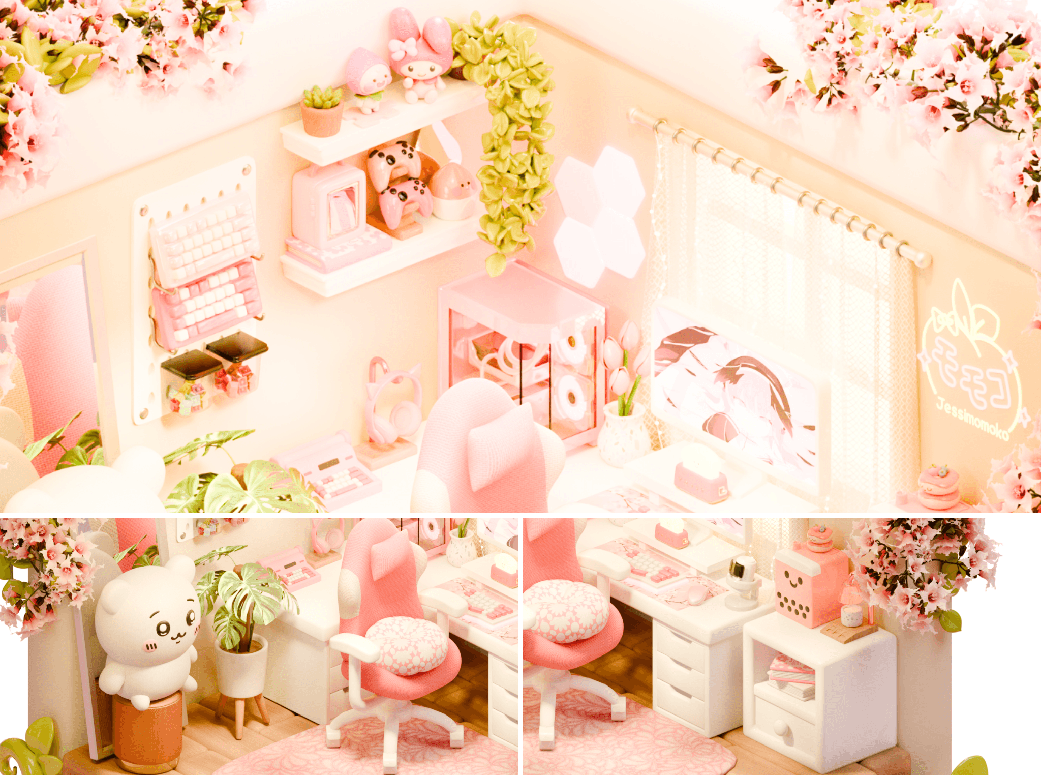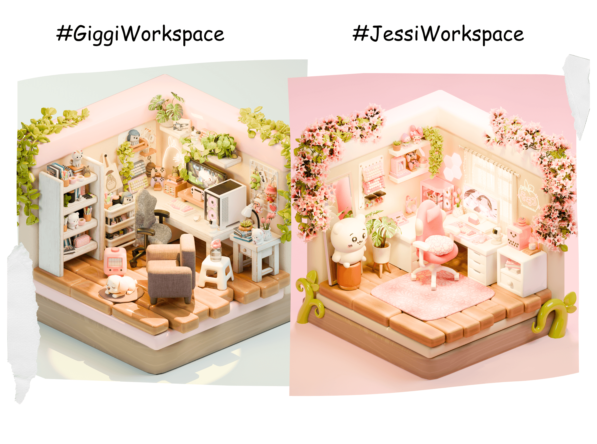 These two gaming workspaces show how a simple layout can have a totally different vibe. Giggi’s Workspace is a calm, nature-filled room with green plants and a peaceful look. Jessi’s Workspace is a bright, "kawaii" dream filled with soft pinks and cherry blossoms. Together, they show how 3D art can turn a small room into a personal, cozy world.