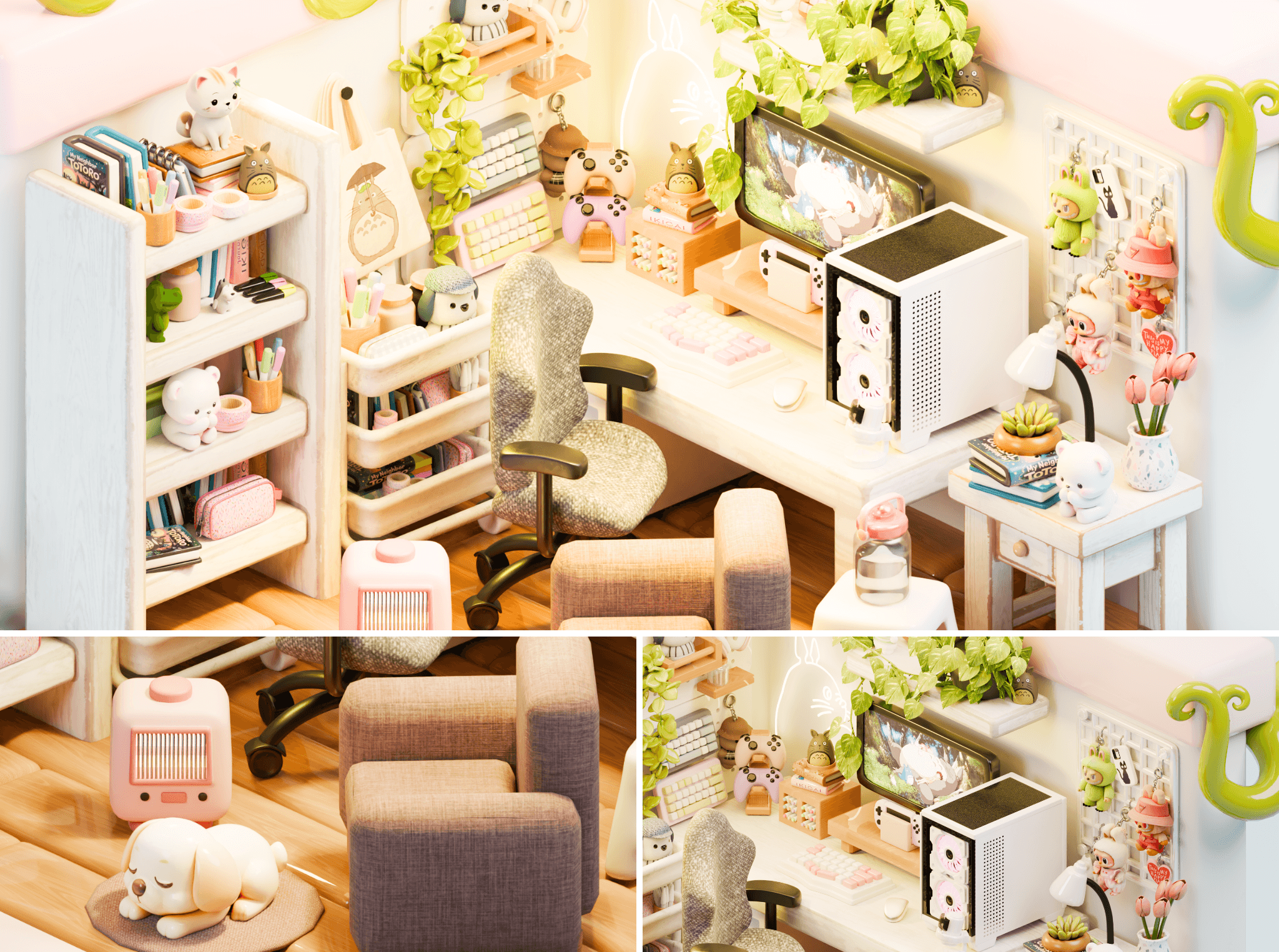 To build these workspaces, I used Blender to create a single base room and then customized the details for each version. I modeled specific props—like the sleeping dog for Giggi and the cherry blossoms for Jessi—to give each space its own personality. By using different lighting setups and color palettes, I was able to turn the same 3D layout into two completely unique environments.